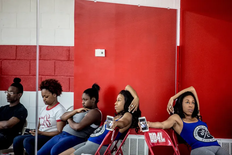Dollhouse founder and Dancing Doll coach Dianna Williams breezes into the production office. She’s wearing tight gray shorts over dance tights, a blue and white tank top that says “Buck or Die,” and a lacefront wig, the curls of which cascade down her back. Hardly dolled up. “See all these businesses? We know everybody,” she says. “Like at Boss Lady’s — her daughter’s a Dancing Doll. Her husband cuts my hair and my son’s hair. People are always like, ‘You all in the ’hood.’ But I like it.”