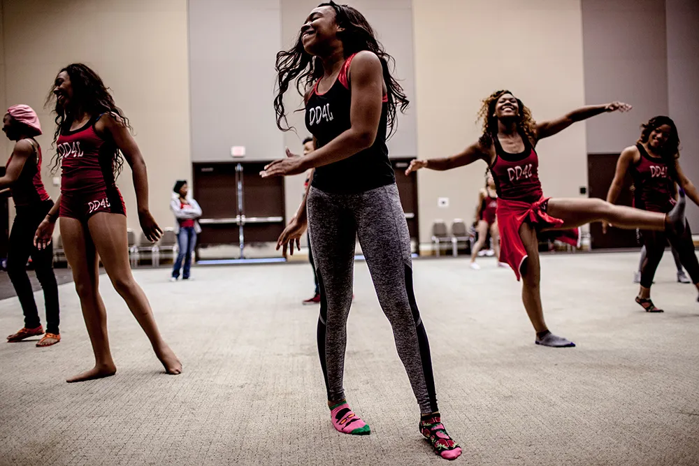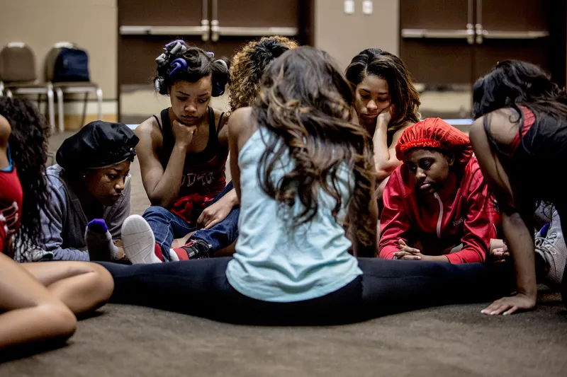 Camryn Harris, 15, leads a walk-through of specific stands — or eight counts of choreography — with her teammates. At her back are the girls performing this week as the Battle Squad — a subsection of the Dancing Dolls, equivalent to a starting lineup. Dressed in red-and-white T-shirts, bare feet, dance shorts and tights printed with “DD4L,” they are MaKalah and Makya, Daija and Shakira, Denicia and Imonje, Faith and Tanesha, Anaya, Crystianna and KenJanae. Girls whose names, in the words of poet Warsan Shire, “command the full use of your tongue.”