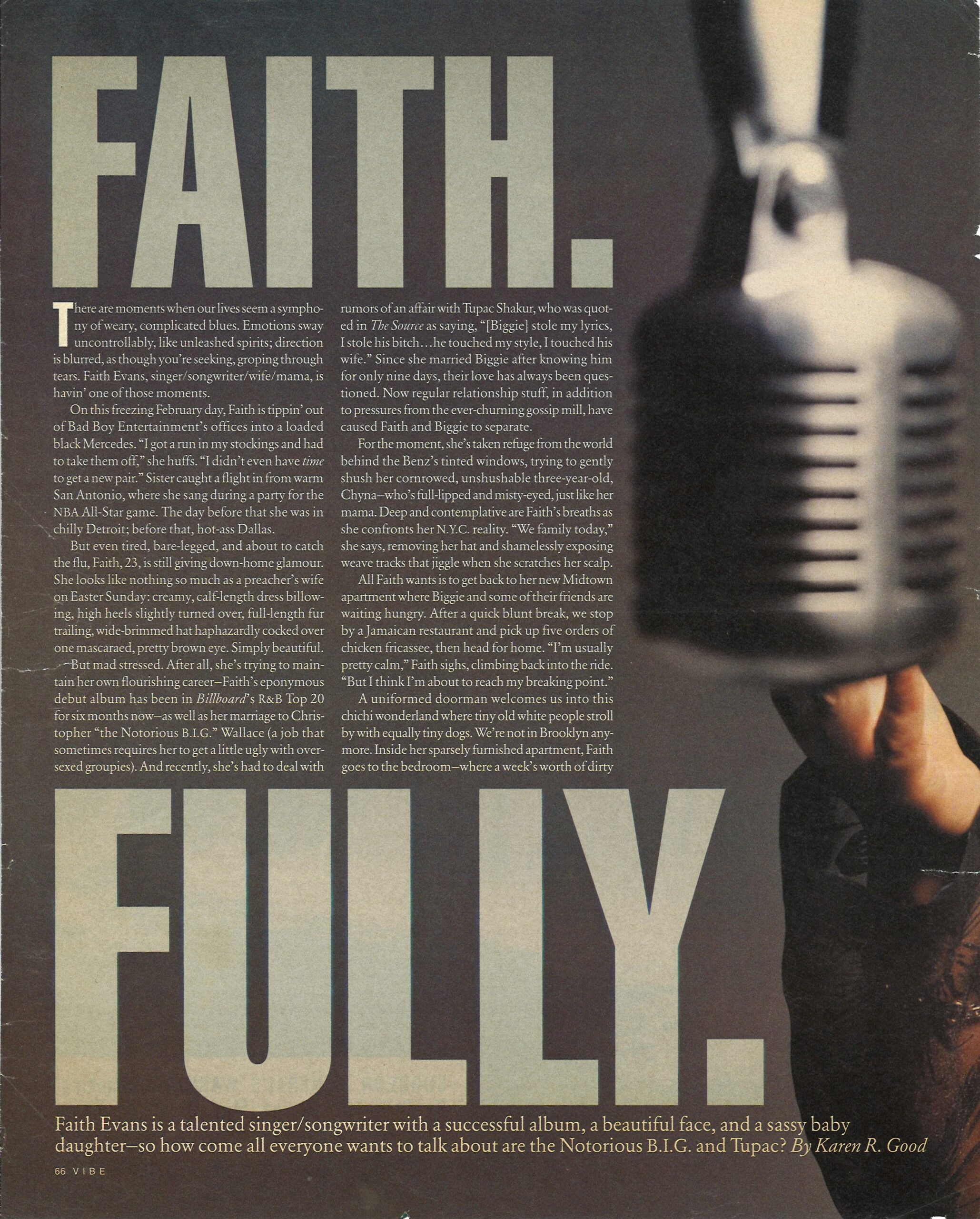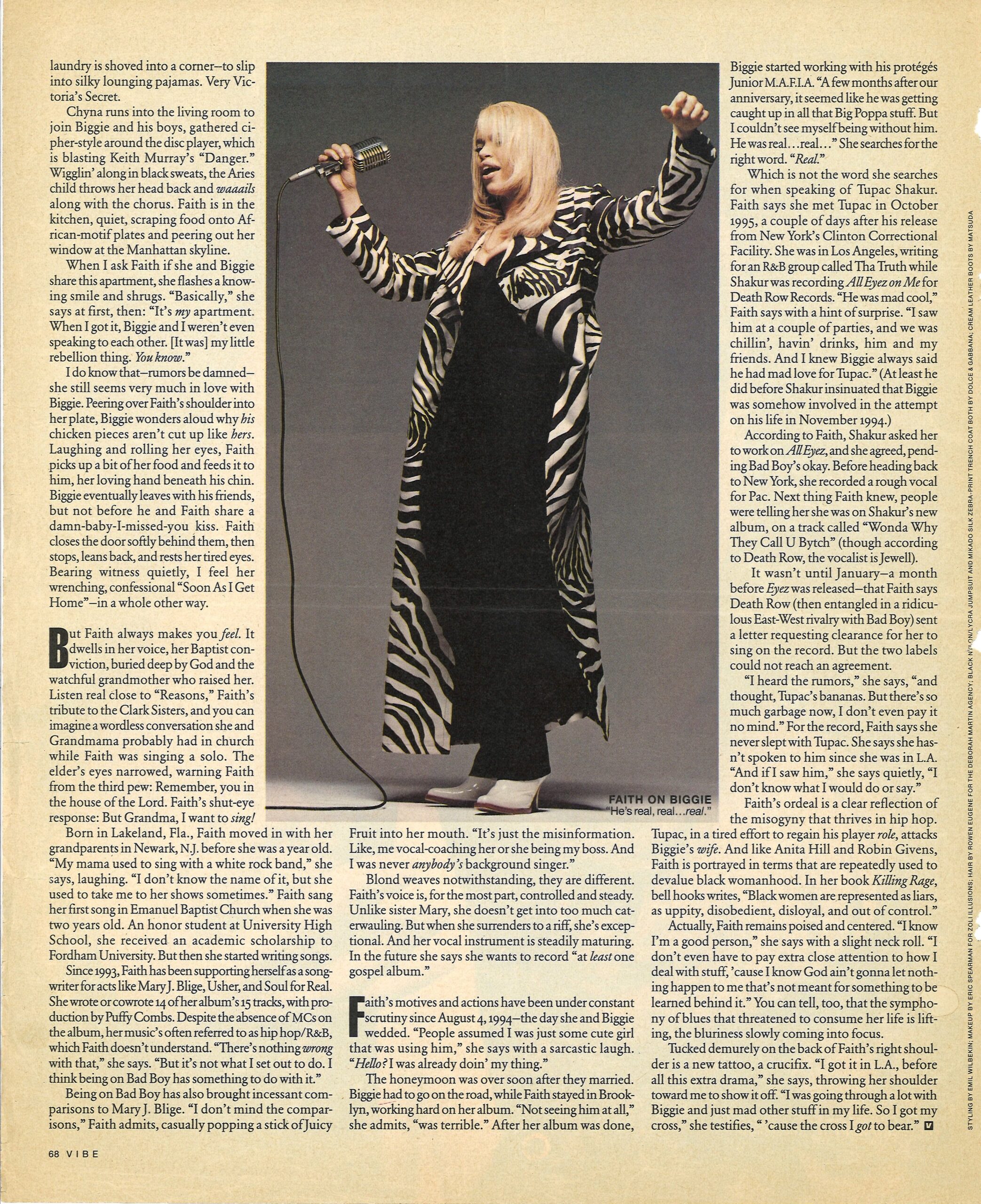 Which is not the word she searches for when speaking of Tupac Shakur. Faith says she met Tupac in October 1995, a couple of days after his release from New York’s Clinton Correctional Facility. She was in Los Angeles, writing for an R&B group called Tha Truth while Shakur was recording All Eyez on Me for Death Row Records. “He was mad cool,” Faith says with a hint of surprise. “I saw him at a couple of parties, and we was chillin’, havin’ drinks, him and my friends. And I knew Biggie always said he had mad love for Tupac.” (At east he did before Shakur insinuated that biggie was somehow involved in the attempt on his life in November 1994.)