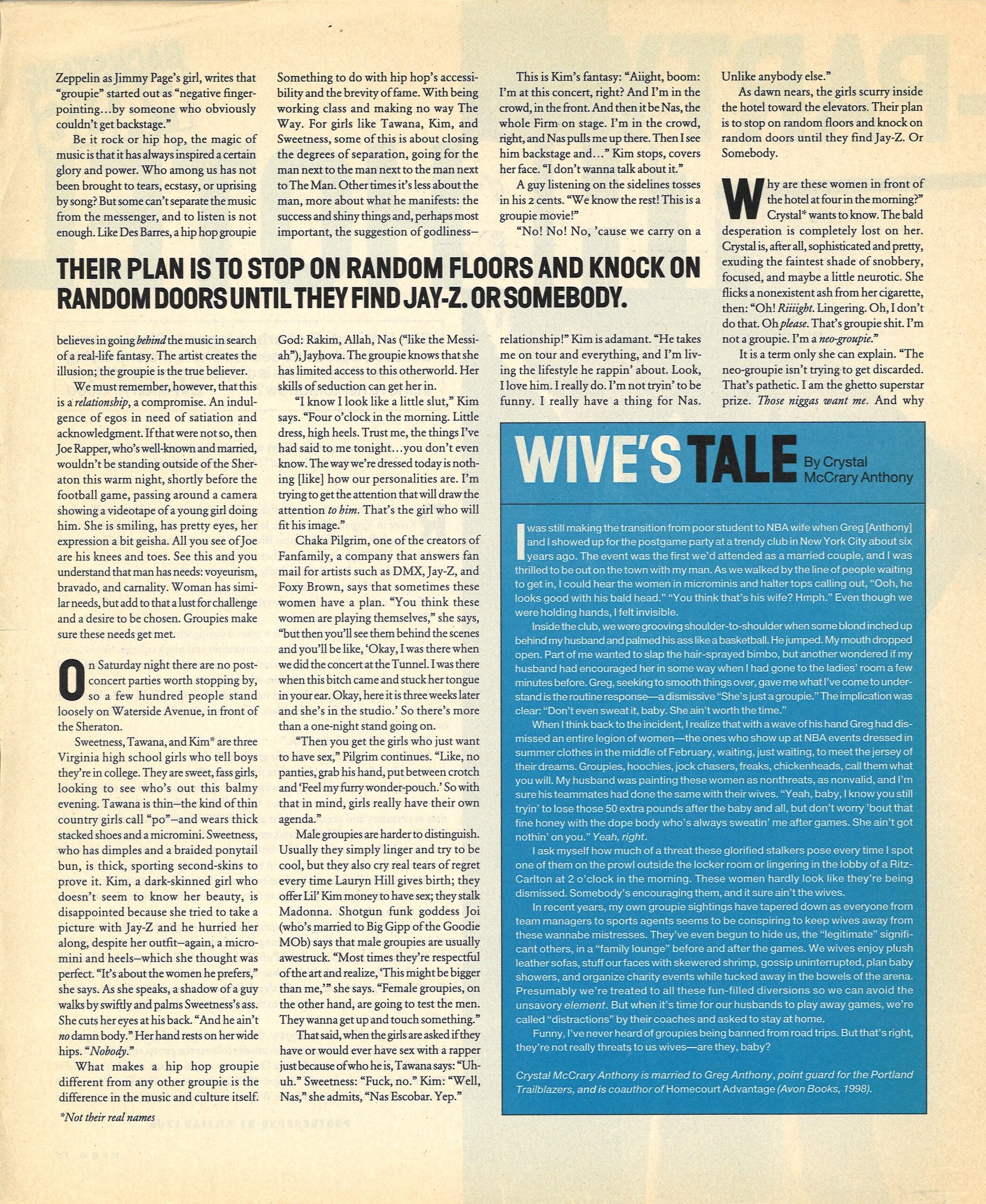 With hip hop generating billions of dollars a year—edging out rock as the lifestyle of the rich and famous—tales of young-girl groupies who haunt productions like the Hard Knock Life tour and the Puff Daddy and the Family tour have become the stuff of urban legend. Did you hear about the two Italian chicks on Survival of the Illest? Ultimate groupies. In every city they did at least 20 niggas apiece! A general rule: The fan might accompany an artist to the hotel room to hang out—but the groupie will hit the artist off.